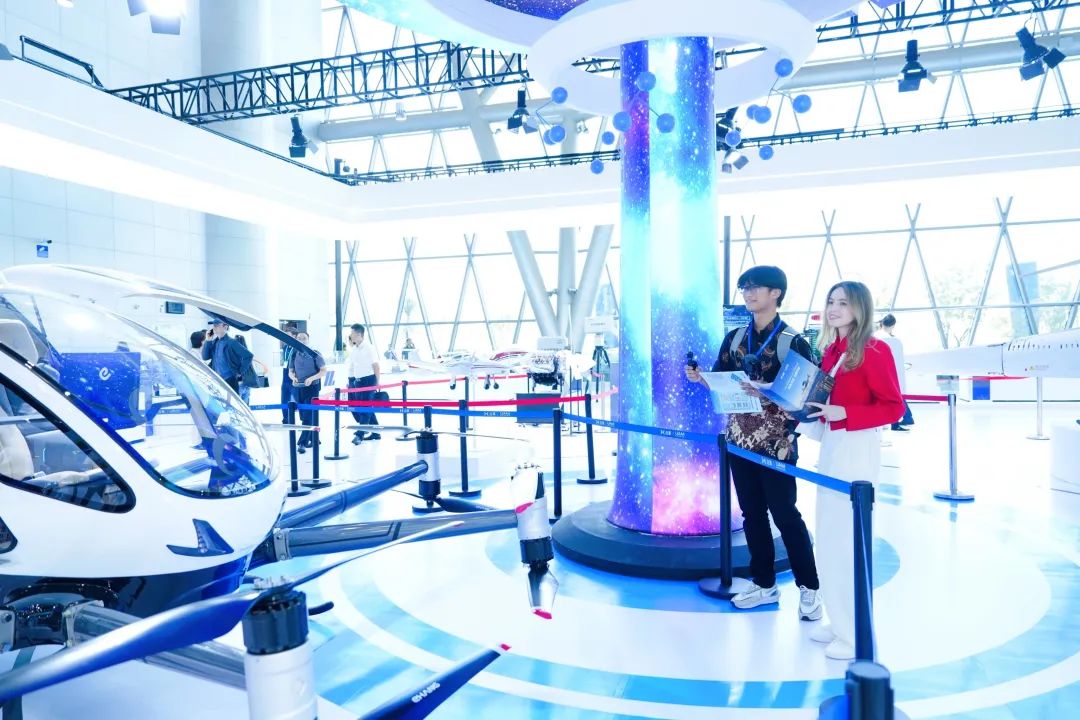 印度尼西亚网红博主陈俊伟(左)、俄罗斯网红博主丽娜参观无人驾驶载人航空器。赵博 摄
