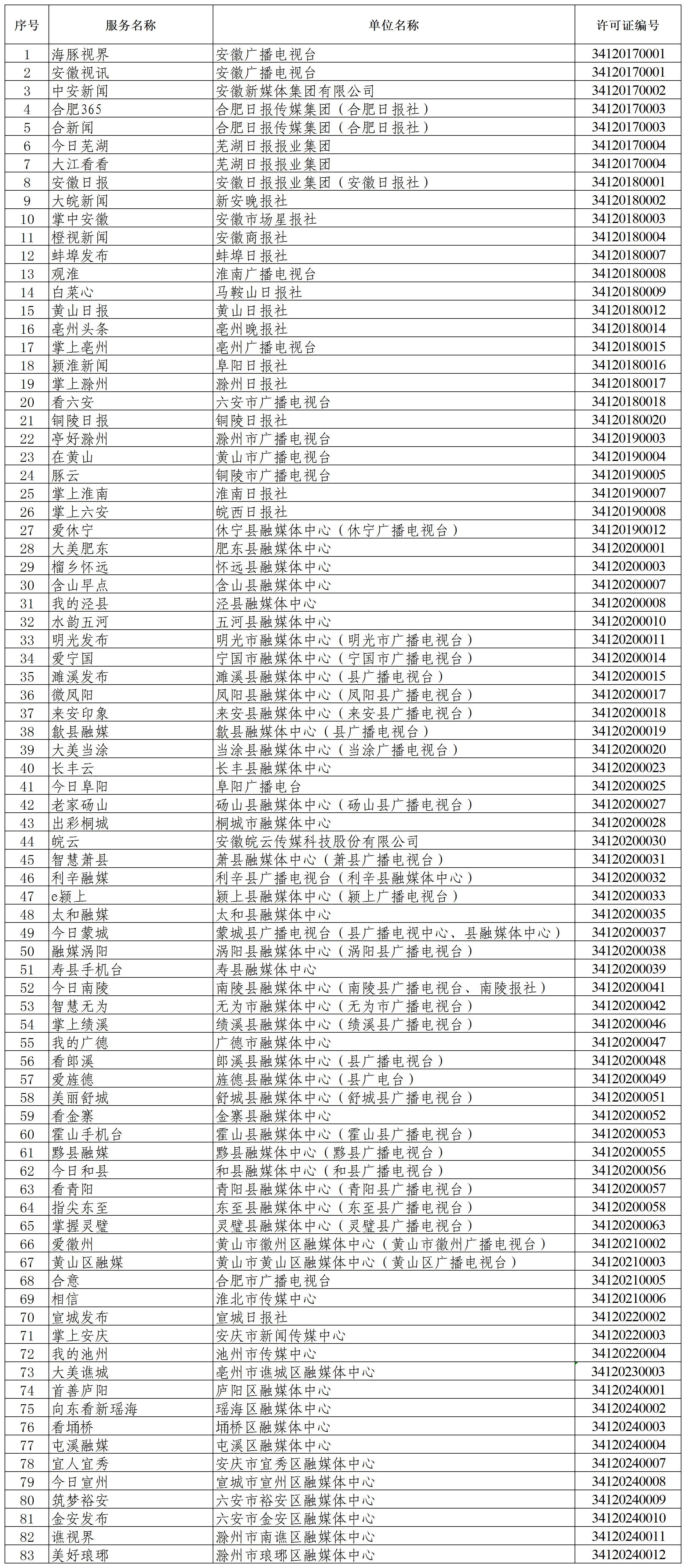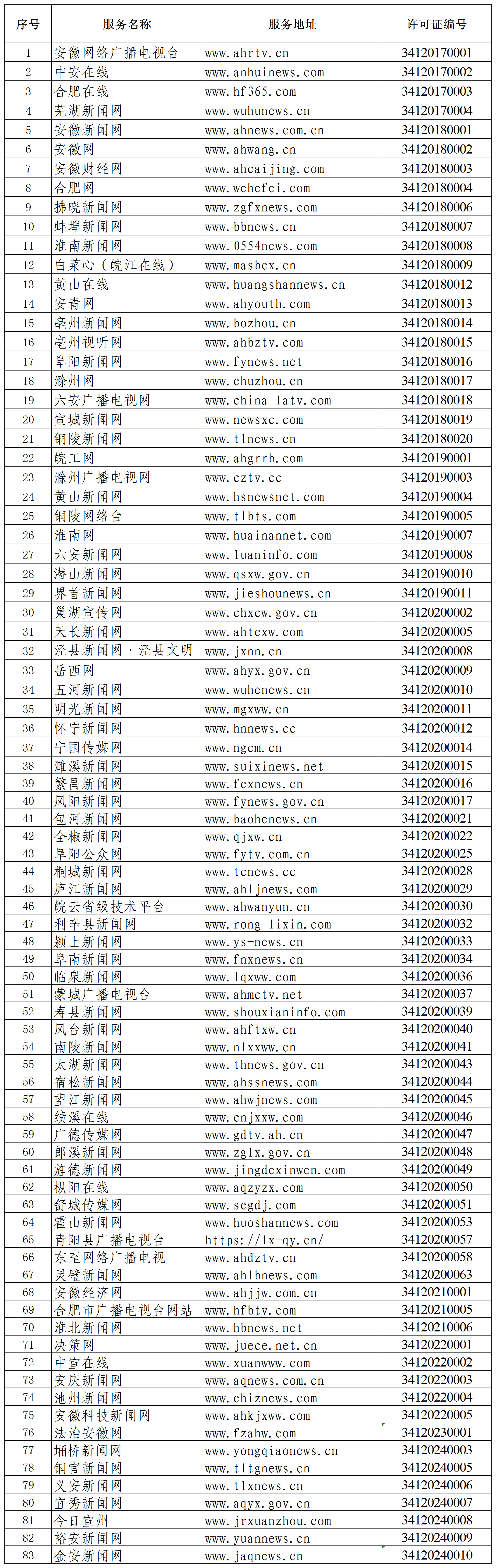 现将安徽省互联网新闻信息服务单位相关许可信息予以公开。截至2024年12月31日,经安徽省互联网信息办公室审批的互联网新闻信息服务单位总计121家,具体包括448个服务项目:互联网站83个,应用程序83个,公众账号282个。