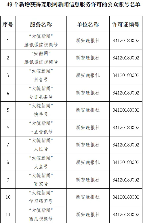安徽省互联网信息办公室持续开展“清朗·整治违规开展互联网新闻信息服务”专项行动,积极推动互联网新闻信息服务单位“持证亮牌”。近日,按照《互联网新闻信息服务管理规定》和国家网信办工作要求,批准新安晚报社等15家单位申报的49个项目从事互联网新闻信息服务。该批服务项目涉及抖音、快手、今日头条等各大网络平台。