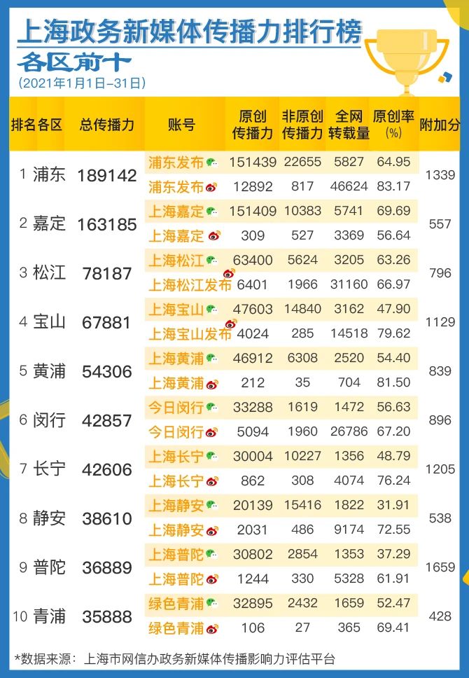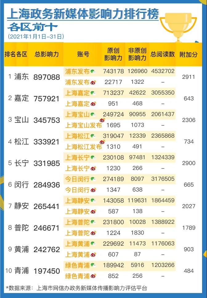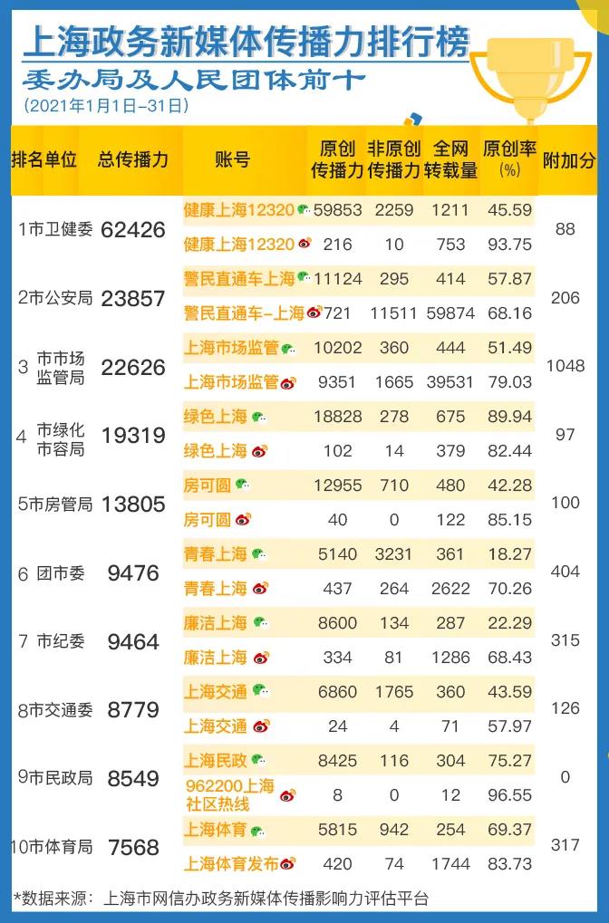 榜单由上海市委网信办与上海市政府新闻办公室联合发布。数据来源于上海市委网信办自主研发的“政务新媒体传播影响力评估平台”,目前该平台覆盖全网各渠道,纳入了276个新闻客户端、251家新闻网站、1200万微信公众号、3亿多微博账号的数据。