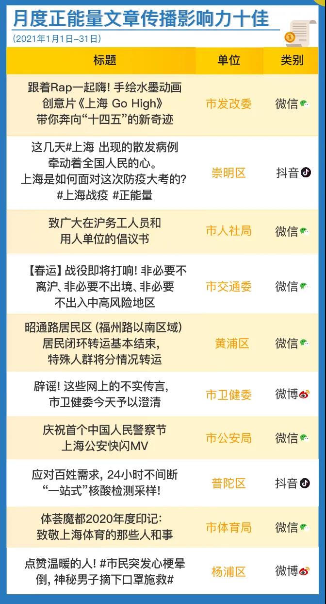 本月正能量十佳稿件中,各单位围绕疫情防控,主动靠前,推出系列优秀稿件。上海市卫健委、黄浦区、普陀区、崇明区及时发布防疫信息,迅速做好精准部署,展现人民城市的速度和温度;市人社局、市交通委优化政务服务,积极倡议在沪人员留沪过年。此外,市发改委创新形式,展望上海“十四五”发展新奇迹;市公安局在首个中国人民警察节策划快闪活动,线上线下有效联动;市体育局视频回顾疫情防控下的“上海体育这一年”;杨浦区关注凡人善举,传递冬日温暖,获得网友点赞。