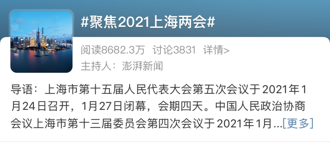 #聚焦2021上海两会#微博话题阅读量:8682.3万