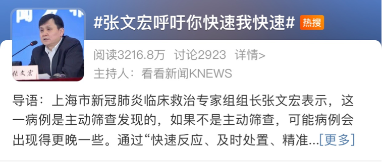 #张文宏呼吁你快速我快速#微博话题阅读量:3216.8万