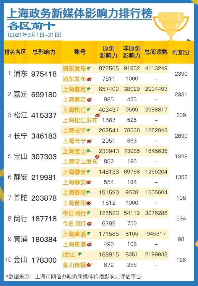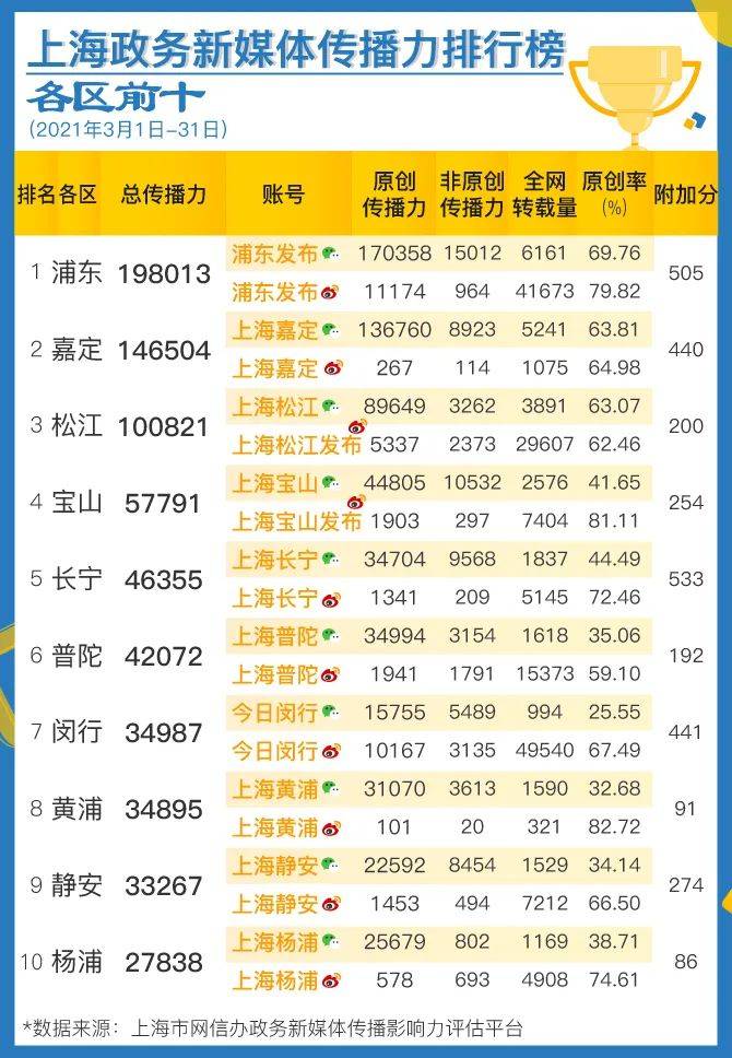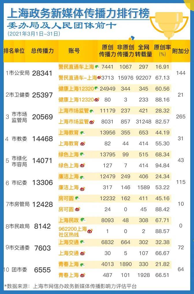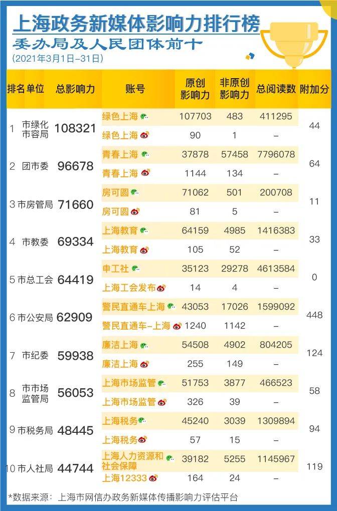 上海市委网信办、市政府新闻办联合发布上海政务新媒体2021年3月传播影响力排行榜。