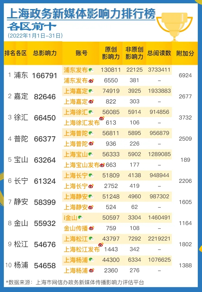 榜单由上海市委网信办与上海市政府新闻办公室联合发布。数据来源于上海市委网信办自主研发的“政务新媒体传播影响力评估平台”,目前该平台覆盖全网各渠道,纳入了276个新闻客户端、251家新闻网站、1200万微信公众号、3亿多微博账号的数据。传播力榜单:考察的是各单位政务微信、微博在全网各渠道被转载的情况。影响力榜单:考察的是各政务微信、微博在全网各渠道被转载后获得的阅读、点赞、评论等情况。附加分:主要体现各政务新媒体参与正能量网上宣传的情况,本月主要是参与疫情防控、上海两会、春节等主题宣传情况。