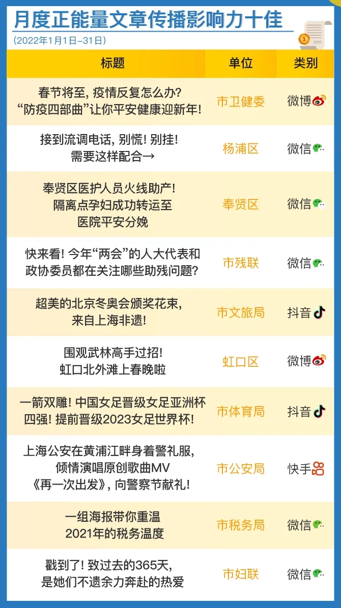 本月正能量十佳稿件中,围绕上海两会,市残联结合主业做好话题设置;政务新媒体始终绷紧疫情防控这根弦,市卫健委、杨浦区提醒市民做好科学防护、配合流调工作,奉贤区呈现防疫中的人性化举措,获得网民较高关注。围绕春节春晚、冬奥、女足亚洲杯等热点,市文旅局、虹口区、市体育局借势发力,稿件传播力影响力明显增加;市公安局献礼警察节的原创MV登上热榜,市税务局、市妇联回顾一年工作,重温2021的温暖与感动,稿件获得关注。