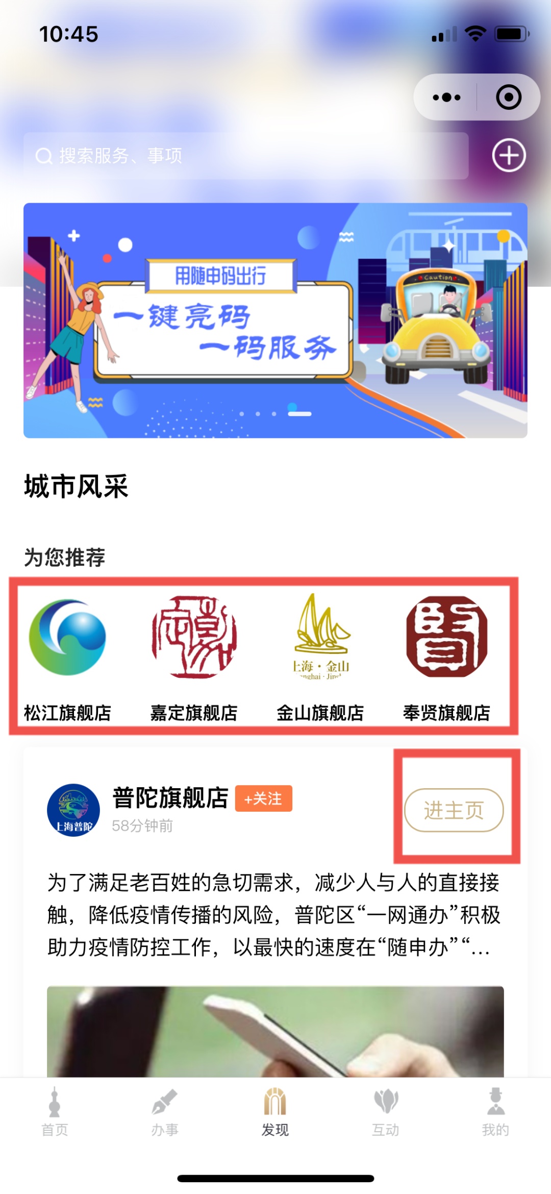 用户通过“随申办”微信小程序、“随申办”app、“随申办”支付宝小程序,进入“发现”频道动态进入该区旗舰店主页。