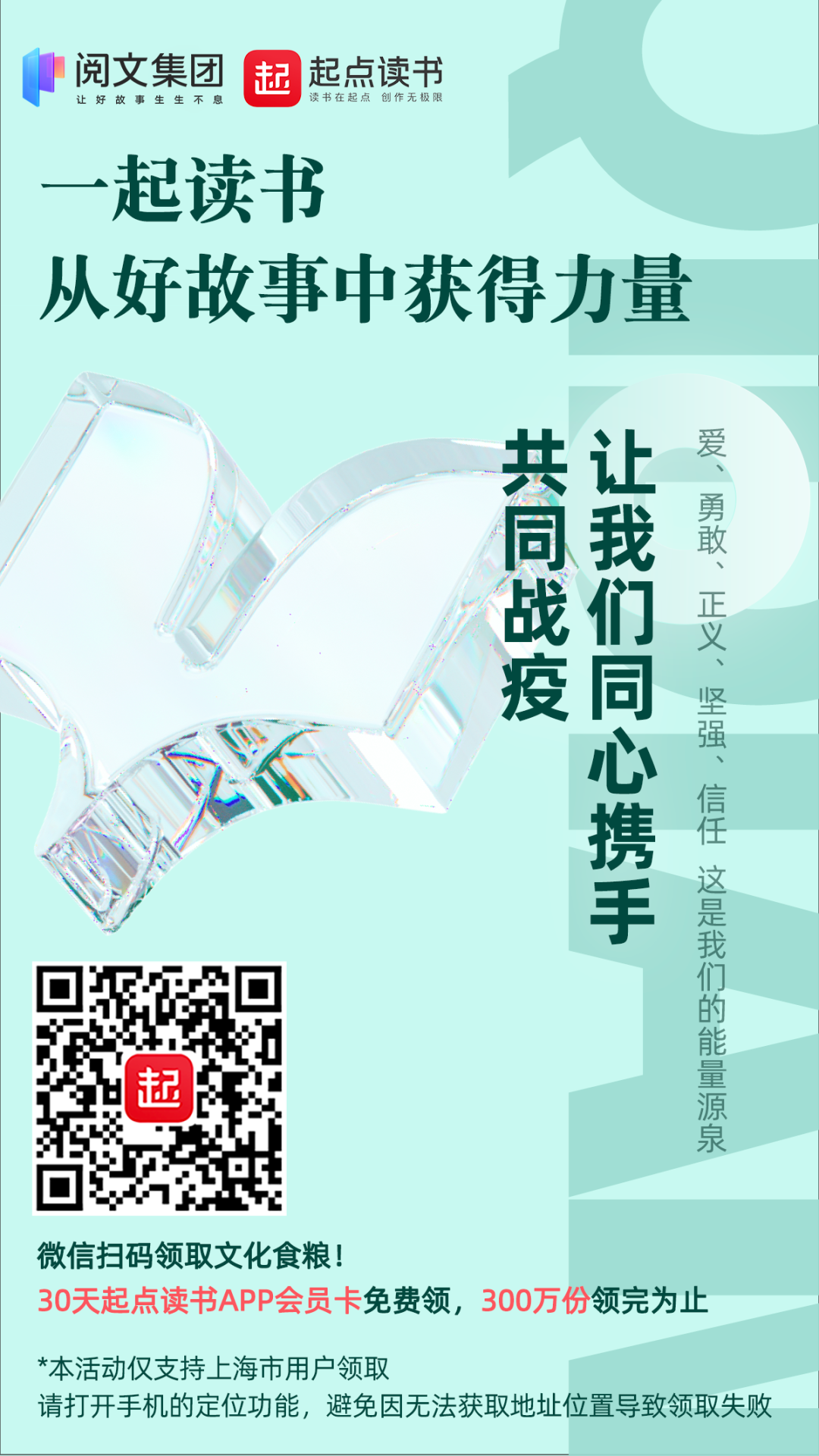阅文集团旗下的起点读书向上海市民免费发放300万份30天起点读书月卡会员,可享受海量精选作品畅读,让市民在宅家防疫抗疫期间享受阅读乐趣,从好故事中汲取力量。