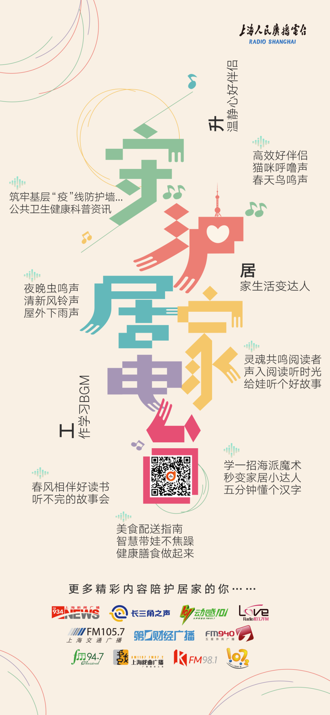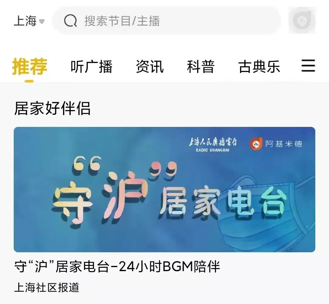 阿基米德特别推出守“沪”居家电台,集合了上海218个街镇一线防控的实时信息播报,及时传递基层动态;同时为居家人群提供健康科普知识、白噪音电台、居家小课堂和众多的优质有声内容,纾解市民在疫情防控期间的焦虑。