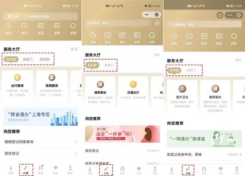 【“随申办”APP】可点击“按专题”在下方左右滑动查看服务专题