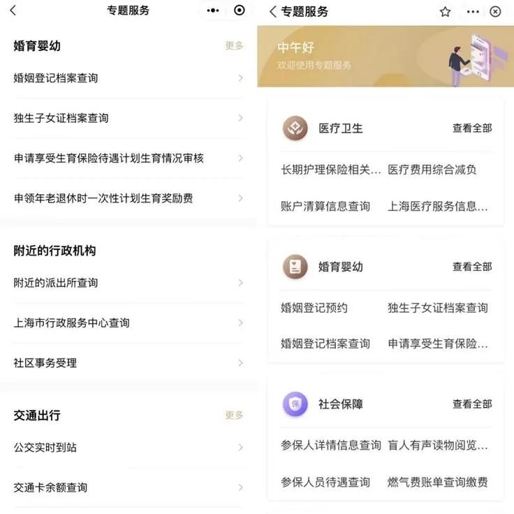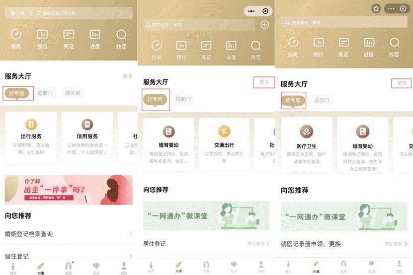 【“随申办”微信、支付宝小程序】可点击“按专题”更多,查看更多服务专题