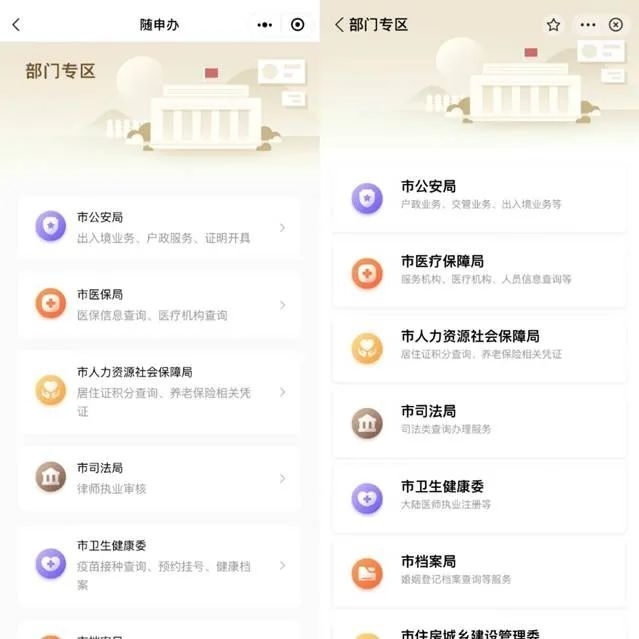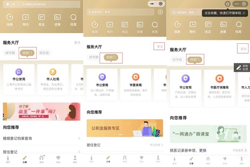 【“随申办”APP】可点击“按部门”→在下方左右滑动查看