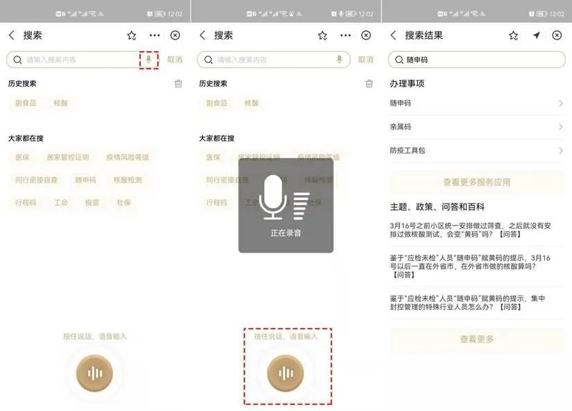 打开 “随申办”APP、“随申办”微信小程序、“随申办”支付宝小程序,点击搜索框,点击“话筒”按钮,语音输入关键字查找服务。