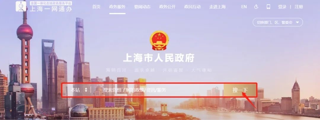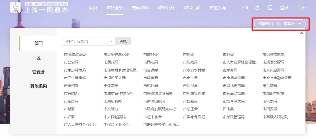点击主页右上角“切换部门、区、管委会”,根据您想要办理的服务,可以手动输入查找,或根据部门选择。