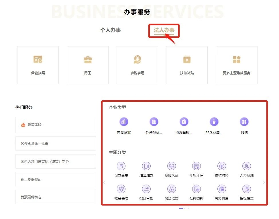 主页向下滑,找到办事服务-法人服务,然后根据您的企业类型或是办事服务的主题类型,进行筛选。