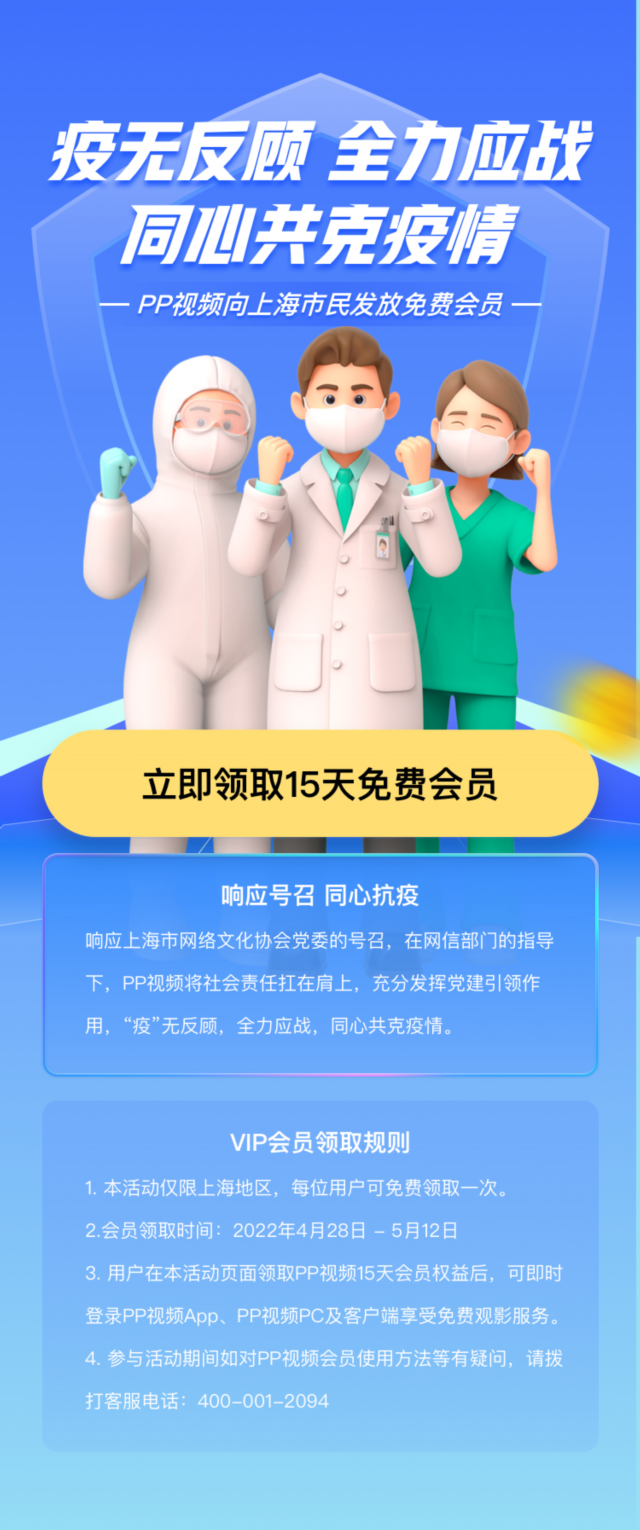 PP视频向上海市民发放免费会员,从4月28日至5月12日期间可领取15天免费会员。