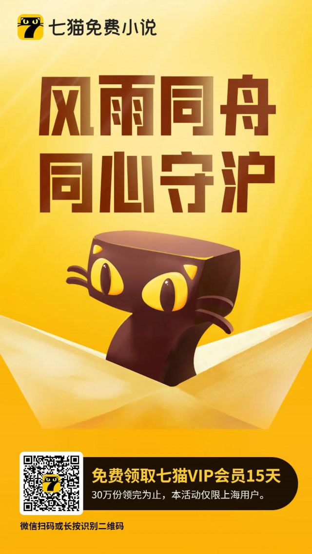 七猫小说向上海市民赠送15天免费VIP会员,自4月28日起限量领取,共30万份。