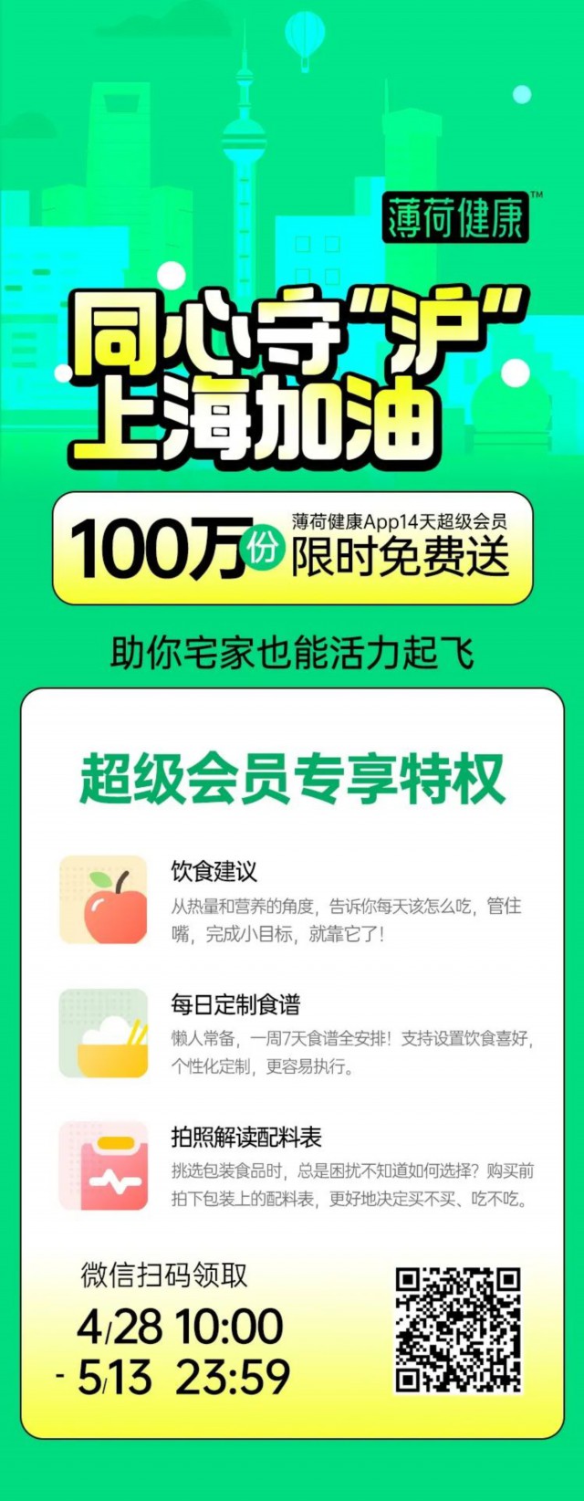 薄荷健康赠送100万份免费会员卡, 从4月28日10:00至5月13日23:59期间可领取14天超级会员。