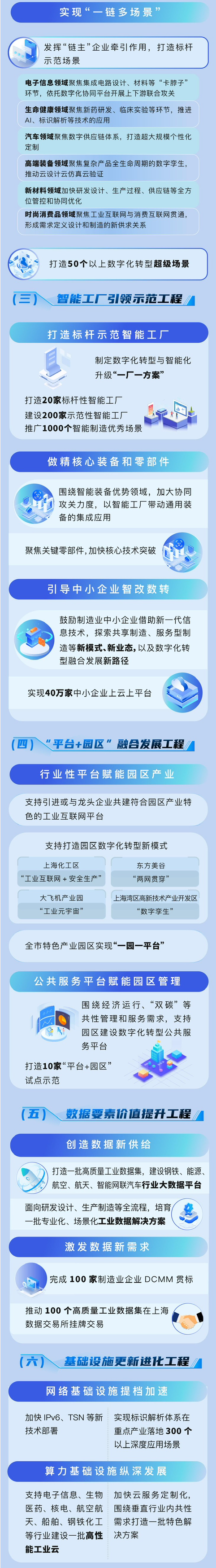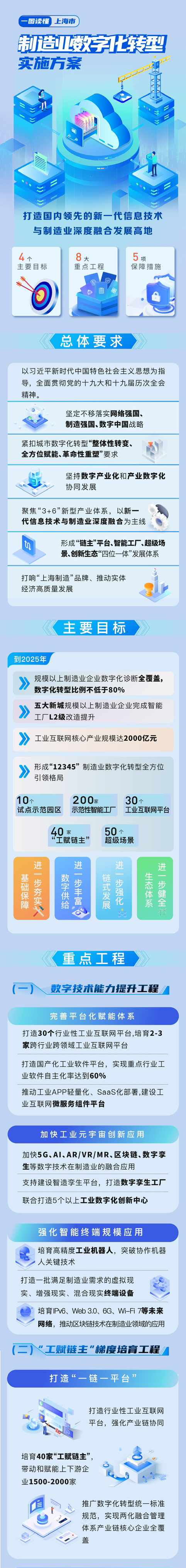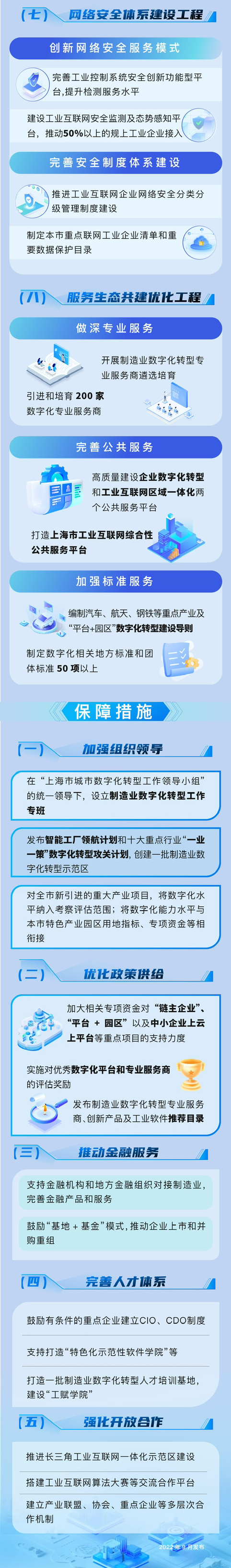 10月8日,上海市数字化办正式印发《上海市制造业数字化转型实施方案》。《实施方案》紧扣“整体性转变、全方位赋能、革命性重塑”内涵要求,通过数据要素、数字技术加快企业组织模式创新、产业链延伸链接、大中小融通发展和生态圈供需适配,重点实施八大专项工程和五项保障措施,通过项目化、工程化方式,加快推动“3+6”重点产业、重点集团、重点园区等新旧动能接续转换,全力打响“上海制造”品牌。详见↓