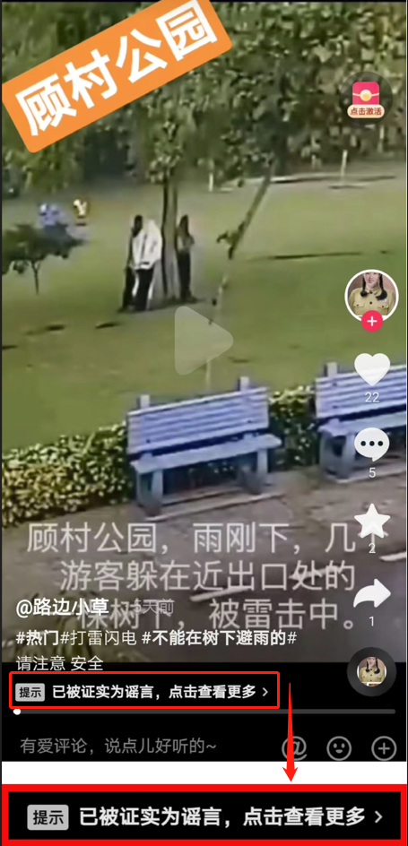 “开局一张图,内容全靠编”。近期,一些“自媒体”账号胡编乱造,将一则印度雷击视频造谣为“上海顾村公园4人被雷击”,引发网民误传。经核查,该视频最早是2021年央视新闻一则关于印度雷击事故的报道视频。个别“自媒体”为了“造热点”“蹭流量”,将原视频掐头去尾,杜撰成上海雷击事故发布到抖音等短视频平台。不明真相的网民跟风转发,以讹传讹,越描越“真”,造成谣言信息快速扩散。
