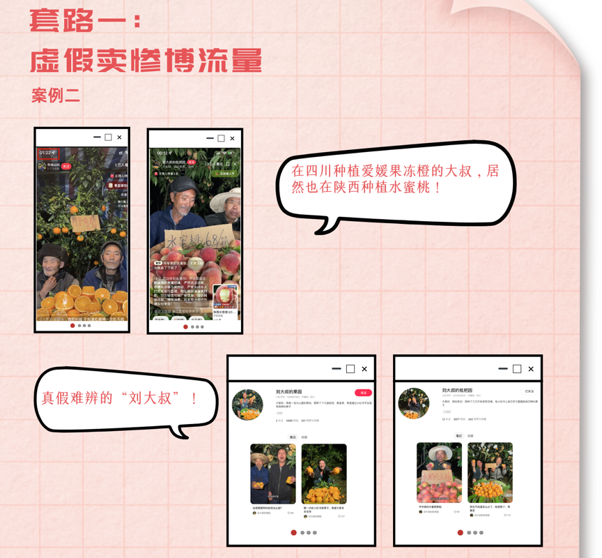 用户“寻味山间”(粉丝数6.48万)致力于打造爱心助农的人设,邀请老人出镜推销水果,希望得到网民帮助。平台发现,其中一位老人被包装为多重人设:在四川种植爱媛果冻橙的大叔,居然也在陕西种植水蜜桃,疑似利用网民对老年人的同情心理售卖商品,消费公众爱心博取流量,平台已依法依约对该账号及其矩阵账号“刘大叔的枇杷园”“刘大叔的果园”作统一封号处置。