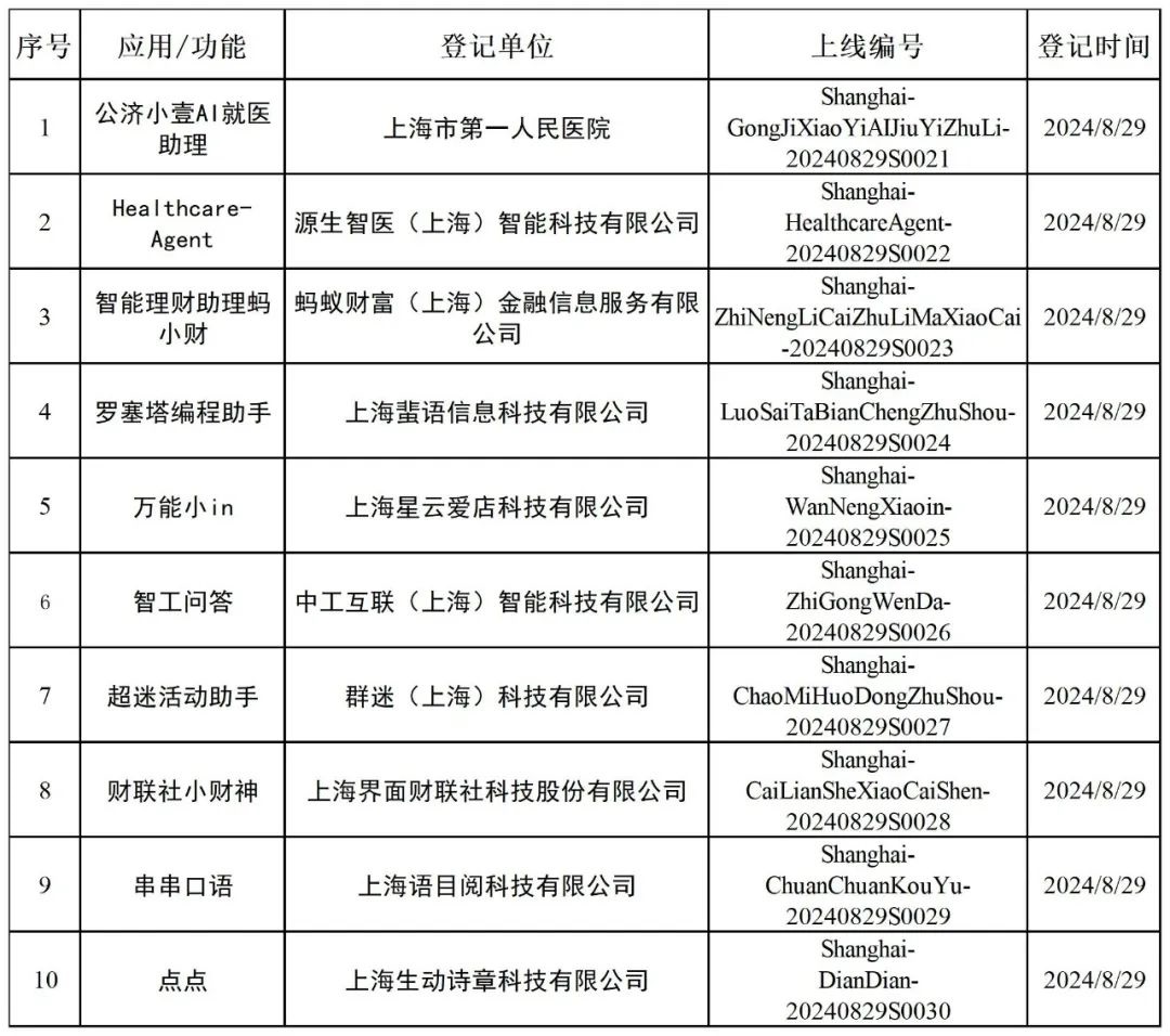 上海市生成式人工智能服务登记信息