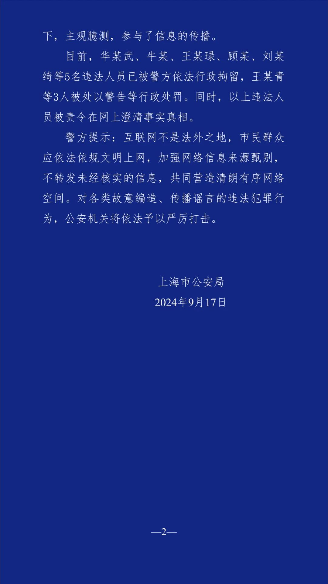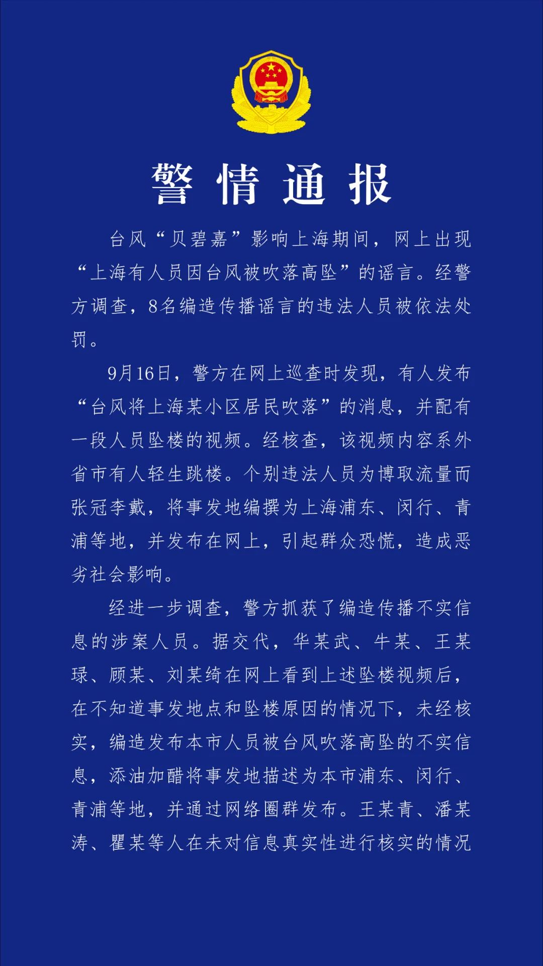 市公安局介绍,8名编造传播“本市有人员因台风被吹落高坠”谣言的违法人员被依法查处。互联网不是法外之地,市民群众应依法依规文明上网,加强网络信息来源甄别,不转发未经核实的信息,共同营造清朗有序网络空间。对各类故意编造、传播谣言的违法犯罪行为,公安机关将依法予以严厉打击。详见↓