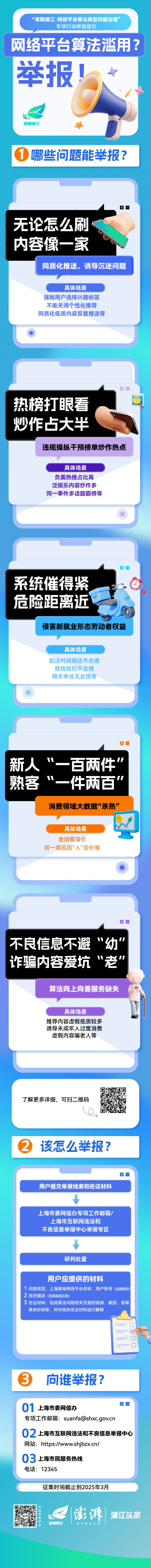 详见《“清朗浦江·网络平台算法典型问题治理”专项行动举报指引》长图↓↓