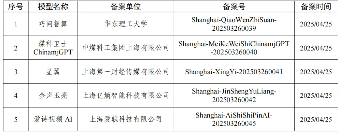 截至4月25日,上海市新增5款已完成备案的生成式人工智能服务,累计已完成71款生成式人工智能服务备案。