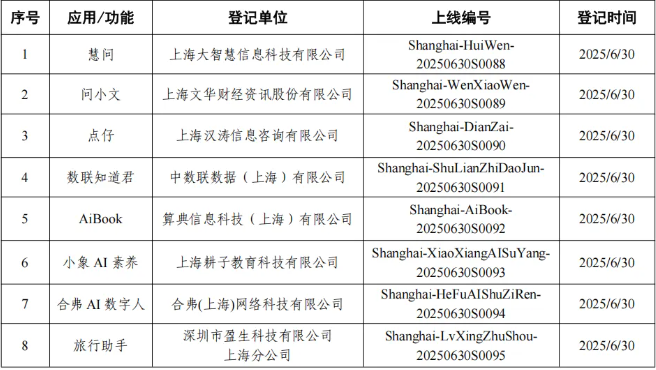 截至6月30日,上海市新增8款已完成登记的生成式人工智能服务,累计已完成95款生成式人工智能服务登记。