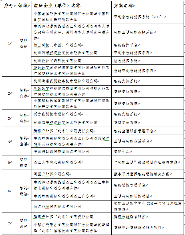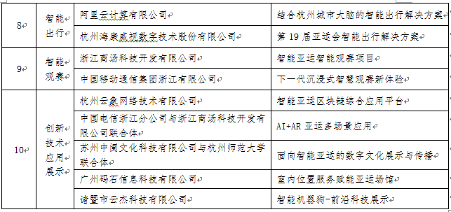 杭州2022年第19届亚运会“智能亚运”重点项目“最佳解决方案”名单