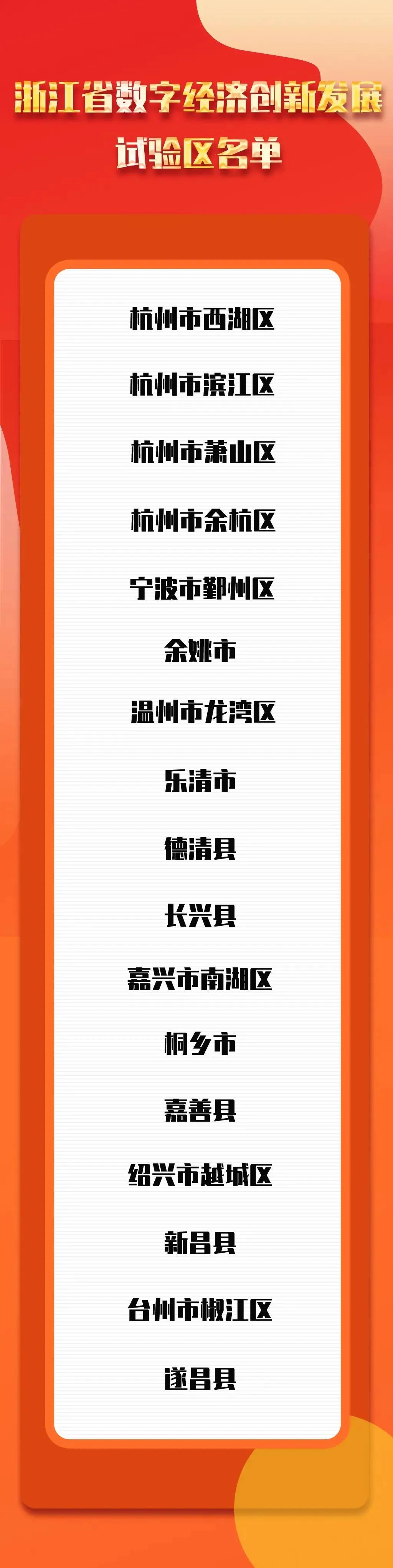 为认真贯彻落实党的十九届五中全会精神和习近平总书记考察浙江重要讲话精神,深入实施数字经济“一号工程”,加快推进国家数字经济创新发展试验区建设,努力打造展示推动数字经济创新发展的重要县域窗口,浙江省数字经济发展领导小组办公室确定以下17个县(市、区)开展省级数字经济创新发展试验区创建工作。