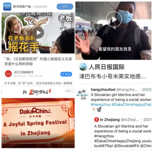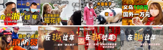 活动组织在浙过年的斯洛伐克的马佳、俄罗斯的德米日、唐曦兰、格鲁吉亚的奈丽、津巴布韦的米莱等10余位国际网络传播达人,以他者视角参与打卡活动,线下体验浙江特色年味,网端表达对春节的真实体验和感悟,通过vlog、短视频、直播等传播 “浙”里文化,推动中国春节文化走出去,也让“重要窗口”更生动地展现在世界眼前。俄罗斯诗人唐曦兰初次到访衢州,就被衢州的“礼”文化深深感染,专门写了一首诗,超过20万网友点击观看。《诗词中的新年》《莱索托姑娘畲乡迎新春》《西蒙一家“打卡中国”》等9个新媒体产品,关联中国诗词、民宿、方言等等主题,充满地方本地特色,累计点击量超300万。《外国人花100元在义乌进货!国外能不能卖到一万元?》视频点击量全网超100万,视频中对比中外小商品价格,网友点赞义乌“对歪果仁来说是个好地方,当地的治理水平也不错”,有外国网友留言:买过的中国商品质量确实好。