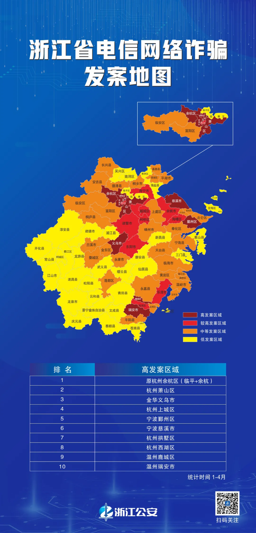 为构建全民反诈、全社会反诈的打防治理电信网络诈骗新格局,浙江省反诈中心发布2021年1至4月份全省各地市、区县的电信网络诈骗案件发案地图。