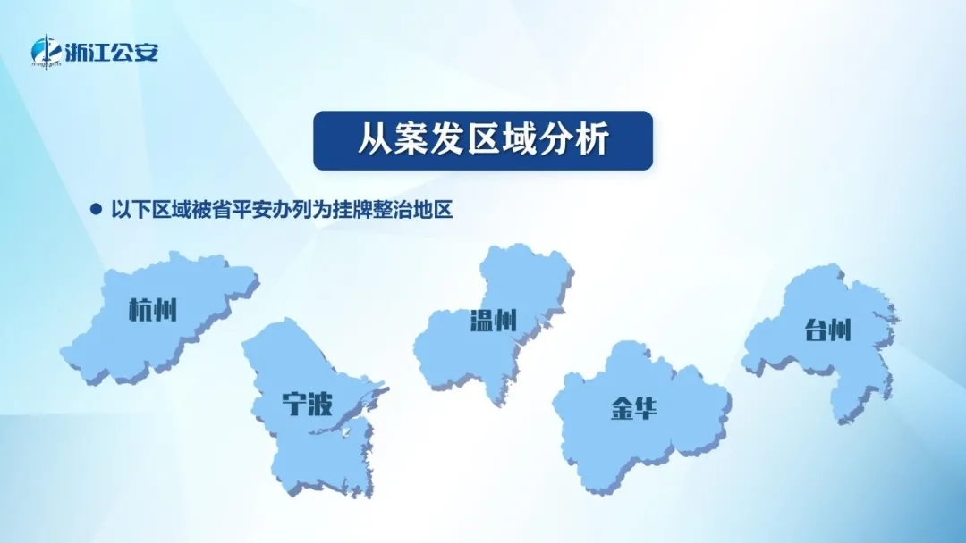 ■杭州、宁波、温州、金华、台州案件高发,被省平安办列为挂牌整治地区。