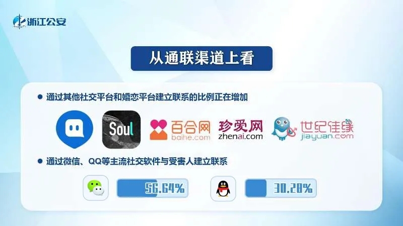 ■微信、QQ等主流社交软件成为犯罪分子与受害人建立联系的最主要通联渠道,分别占56.64%、30.28%。陌陌、soul等社交软件及世纪佳缘、珍爱网等婚恋平台引流后建立联系的比例在增加。