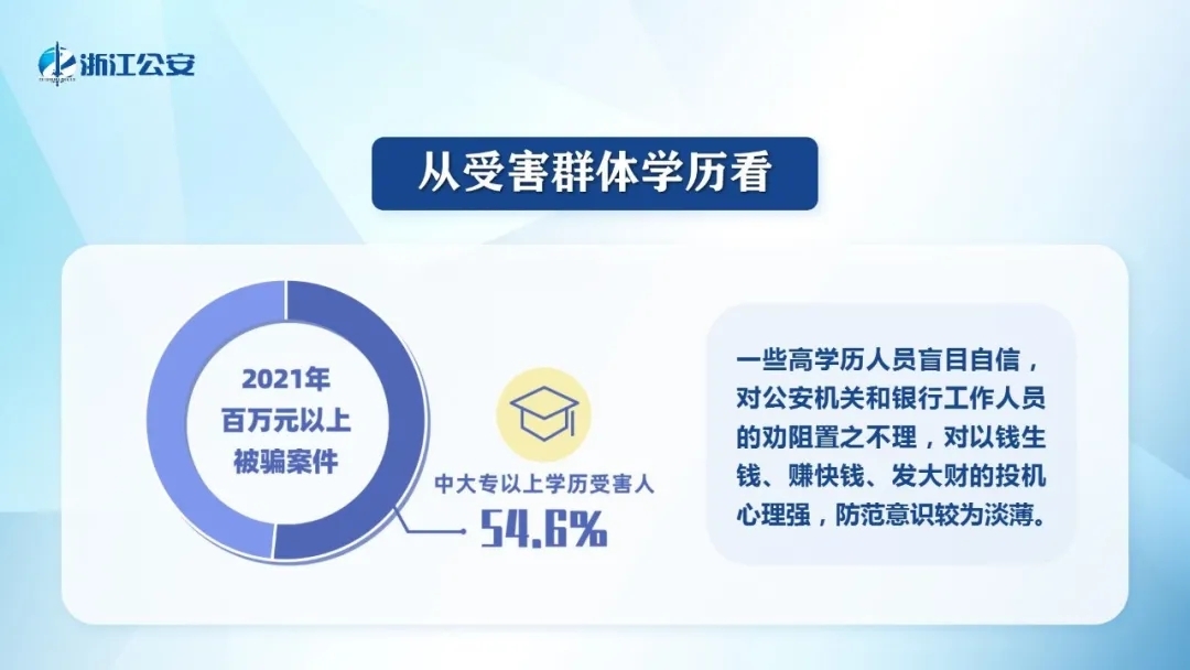 ■高学历人群被骗百万元以上重大案件占比较高,中大专以上学历受害人占54.6%。