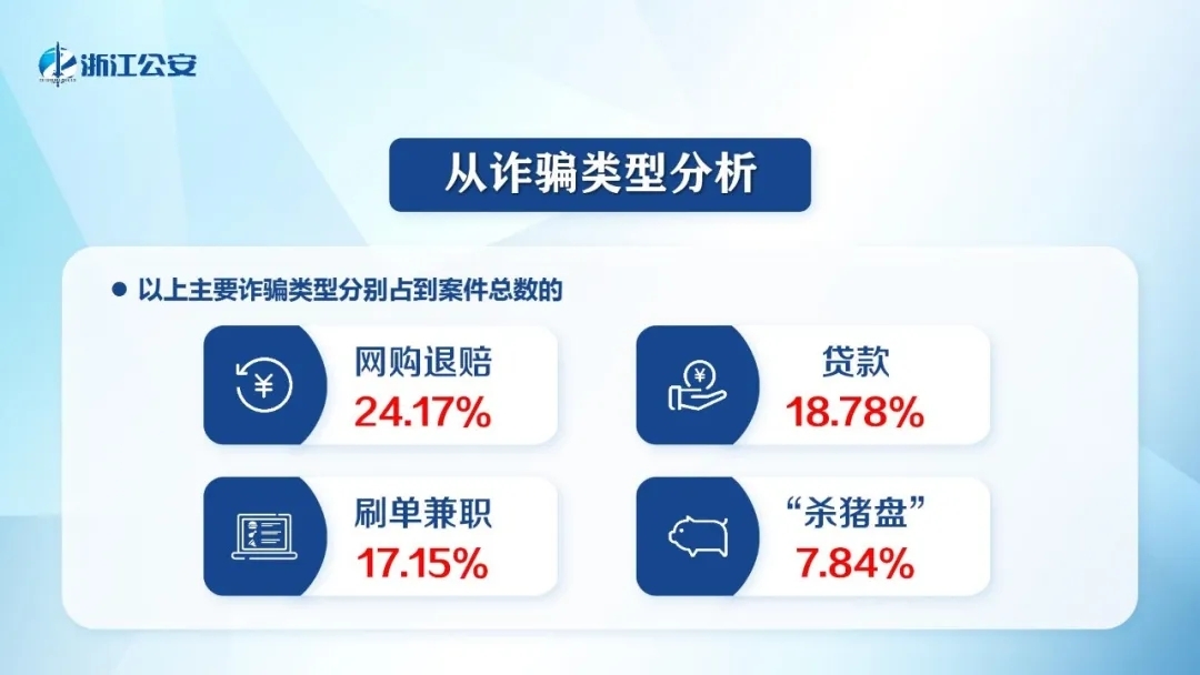 ■网购退赔诈骗、贷款诈骗、刷单兼职诈骗、“杀猪盘”类诈骗成为最常见的诈骗类型,分别占案件总数的24.17%、18.78%、17.15%、7.84%。