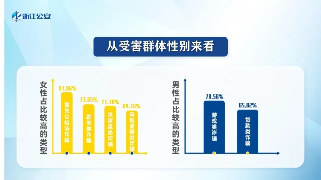 ■女性在冒充公检法类、刷单类、“杀猪盘”类、网购退赔类诈骗这几类诈骗中占比最高,分别达到了91.96%、73.65%、71.18%、64.16%;男性占48.81%,另外男性在游戏类、贷款类诈骗两类诈骗中占比最高,达到了79.56%、65.82%。