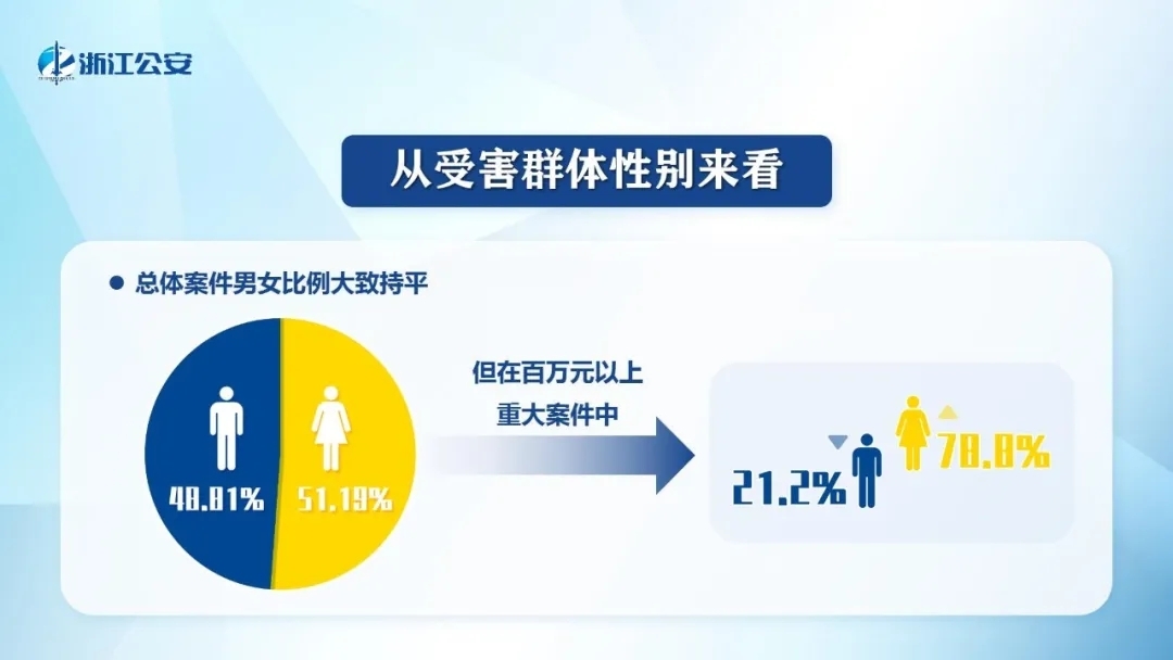 ■受害群体性别女性占51.19%、男性占48.81%,百万元以上案件,女性占78.8%。
