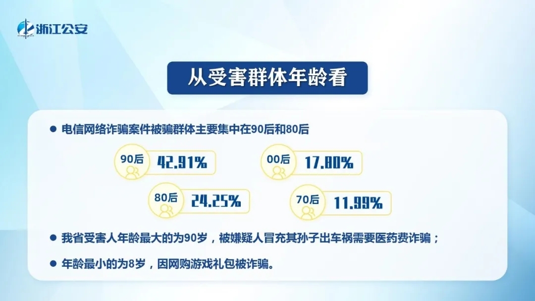 ■“90后”和“80后”是主要被骗群体,分别占42.91%、24.45%。“00后”占17.80%,“70后”占11.99%。浙江省受害人年龄最大的90岁,被嫌疑人冒充其孙子出车祸需要医药费诈骗;年龄最小的8岁,因网购游戏礼包被诈骗。