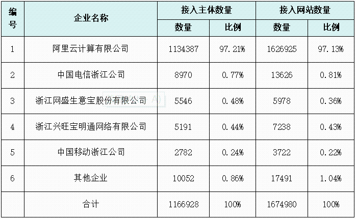 截至2022年6月,浙江接入服务企业共126家,接入主体数量116.69万个,接入网站数量167.50万个(位居全国第一)。在浙江进行备案的网站数量26.98万个,其中非经营性网站有26.83万个,经营性网站有1501个,分别占比99.44%和0.56%。