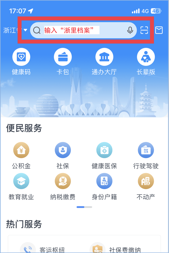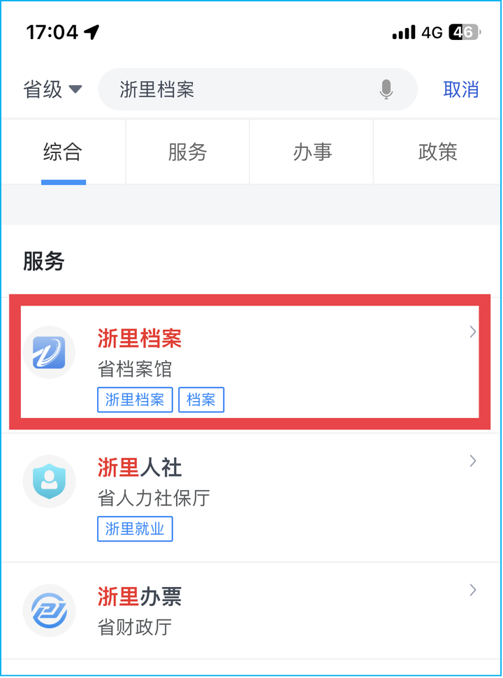 1.在“浙里办”APP顶部搜索“浙里档案”