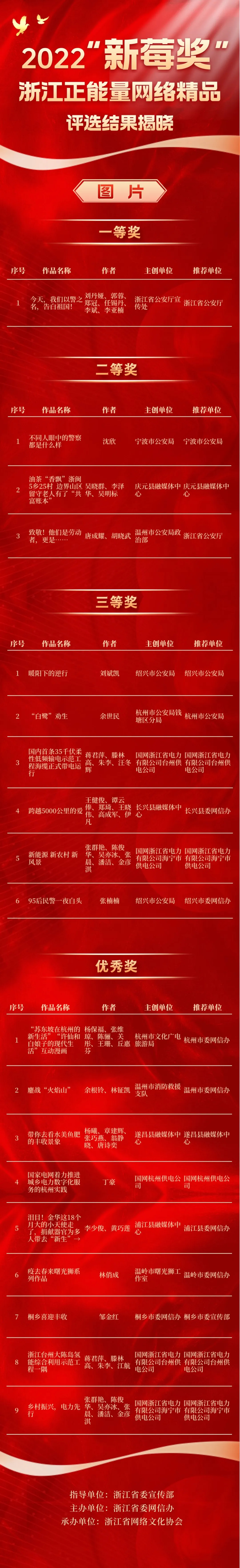 2022“新莓奖”浙江正能量网络精品评选结果于近日揭晓。活动共收到各地、各单位选送的参评作品1100余件。经专家审评,共评选出获奖作品94件,其中《田埂上的造梦师》等9件作品获得一等奖,《镇海炼化白鹭全球慢直播》等19件作品获得二等奖,《台州女性百年百人百事》等31件作品获得三等奖,《浔轩平:浔声而来、理上网来》等35件作品获得优秀奖,名单如下: