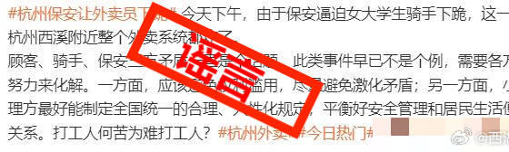 8月12日,网传“杭州保安逼迫女大学生外卖员下跪”“在现场的外卖骑手集体被封号”等信息。经与公安机关、某外卖平台多方核实,以上信息不实,系谣言!“西湖发布”“平安西湖”官方微博已于当晚发布警情通报。请广大网民加强对网上虚假信息的甄别,不信谣、不传谣,共同维护网络清朗。