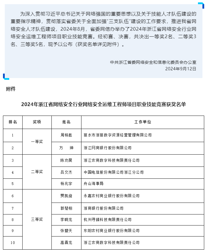 省委网信办关于2024年浙江省网络安全行业网络安全运维工程师项目职业技能竞赛获奖名单的公告