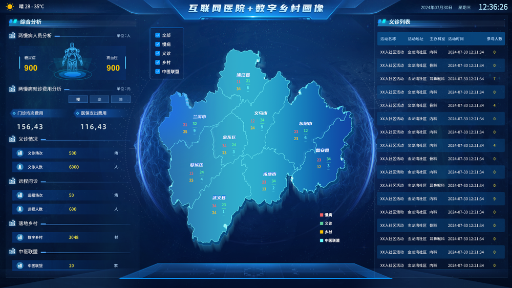 此外,浙江移动还助力开发了“互联网医院+数字乡村画像驾驶舱”及线下关怀系统,通过数据可视化,清晰呈现了义诊、远程问诊和中医资源的分布,有助于精准管理慢性病患者,为健康管理提供有力的数据支持。