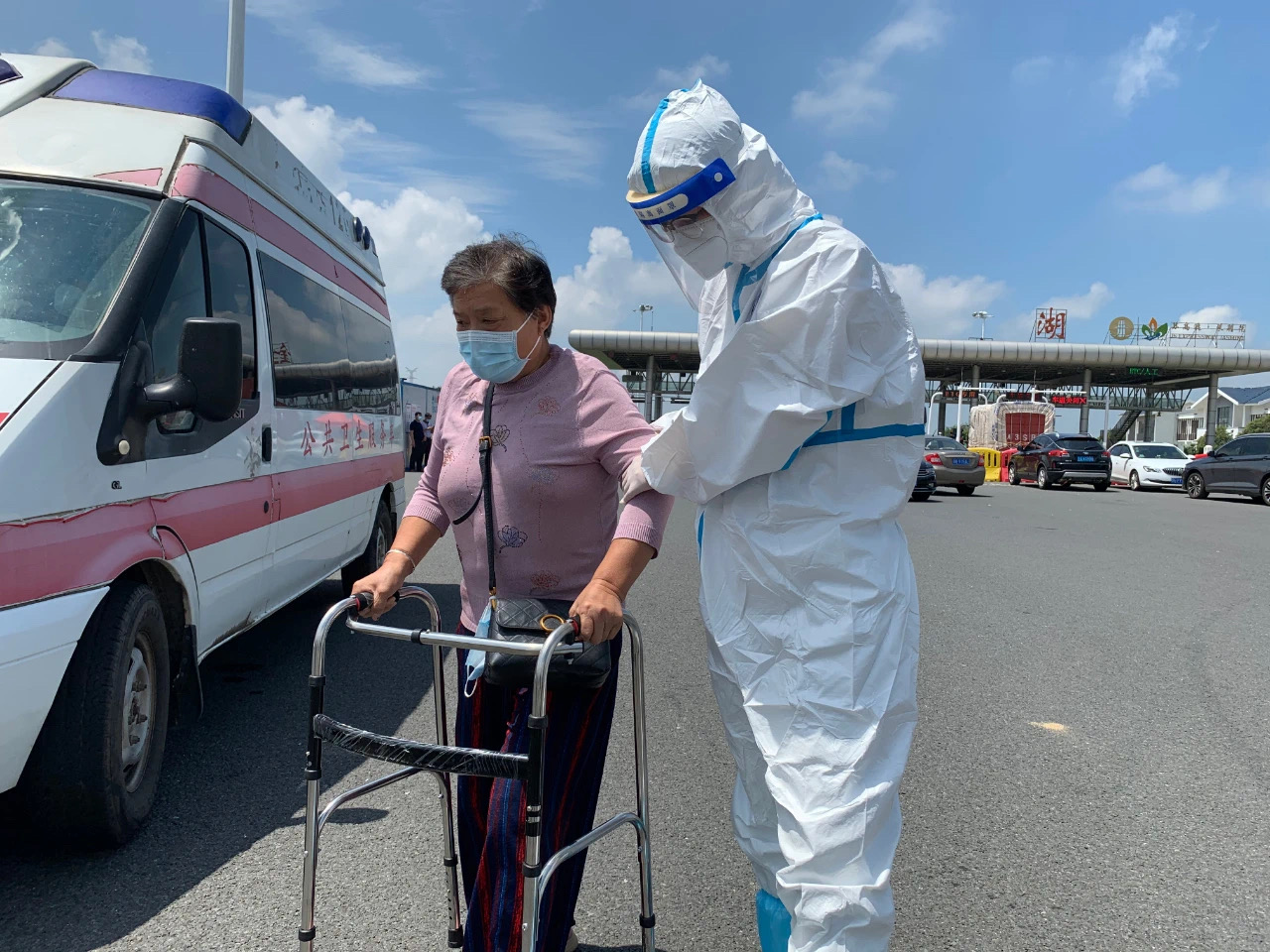 经过1个半小时左右的车程,11点20分,车辆抵达了金湖县收费站。在收费站附近,金湖县卫健委安排的医护人员逐一查验了车内人员的核酸检测阴性证明、苏康码绿码后,将孙后梅快速转移至另一辆车中。