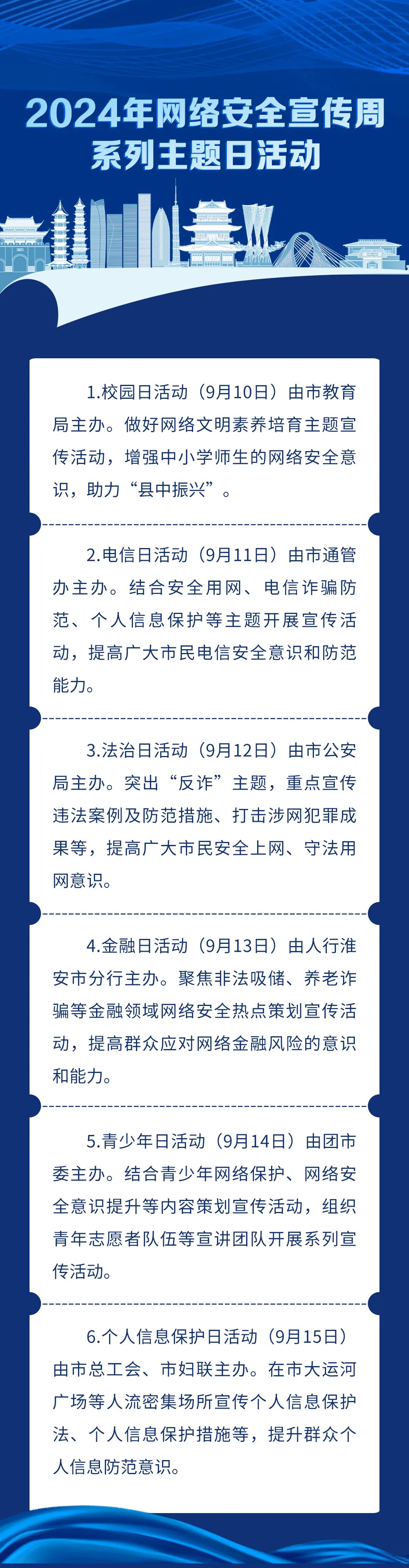 今年淮安市的网络安全宣传周以“网络安全为人民 网络安全靠人民”为主题,宣传周期间,市、县(区)将同步举办“校园日、电信日、法治日、金融日、青少年日、个人信息保护日”系列主题日活动,着力提升各地各部门和全社会网络安全意识,让网络安全更加深入人心。市委常委、宣传部部长、秘书长李森出席开幕式并讲话。