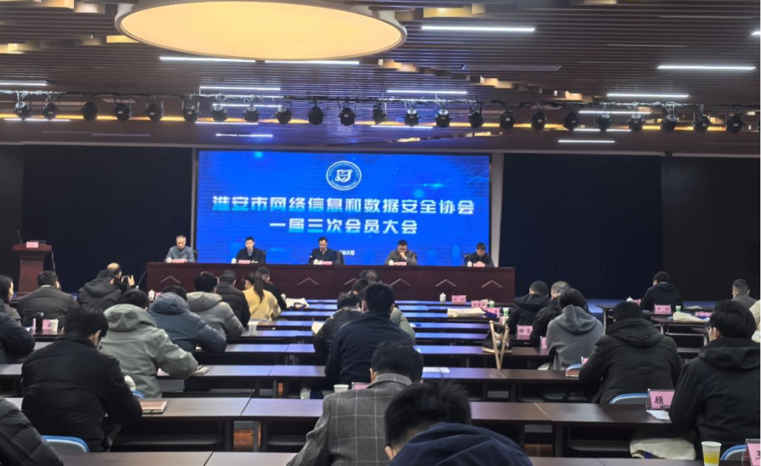 2025年2月27日上午,淮安市网络信息和数据安全协会一届三次会员大会在淮安智慧谷会议中心顺利召开。受市委网信办领导委托,市网络安全应急指挥中心主任孙权出席会议并致辞;协会会长、淮安易云科技有限公司董事长朱峰平出席会议并作年度工作报告;市民政局社会组织管理处处长张南起、市委网信办网安处副处长何权等嘉宾出席会议。会议由协会驻会副会长、淮阴工学院原副校长陆为群主持。
